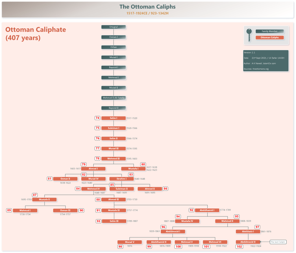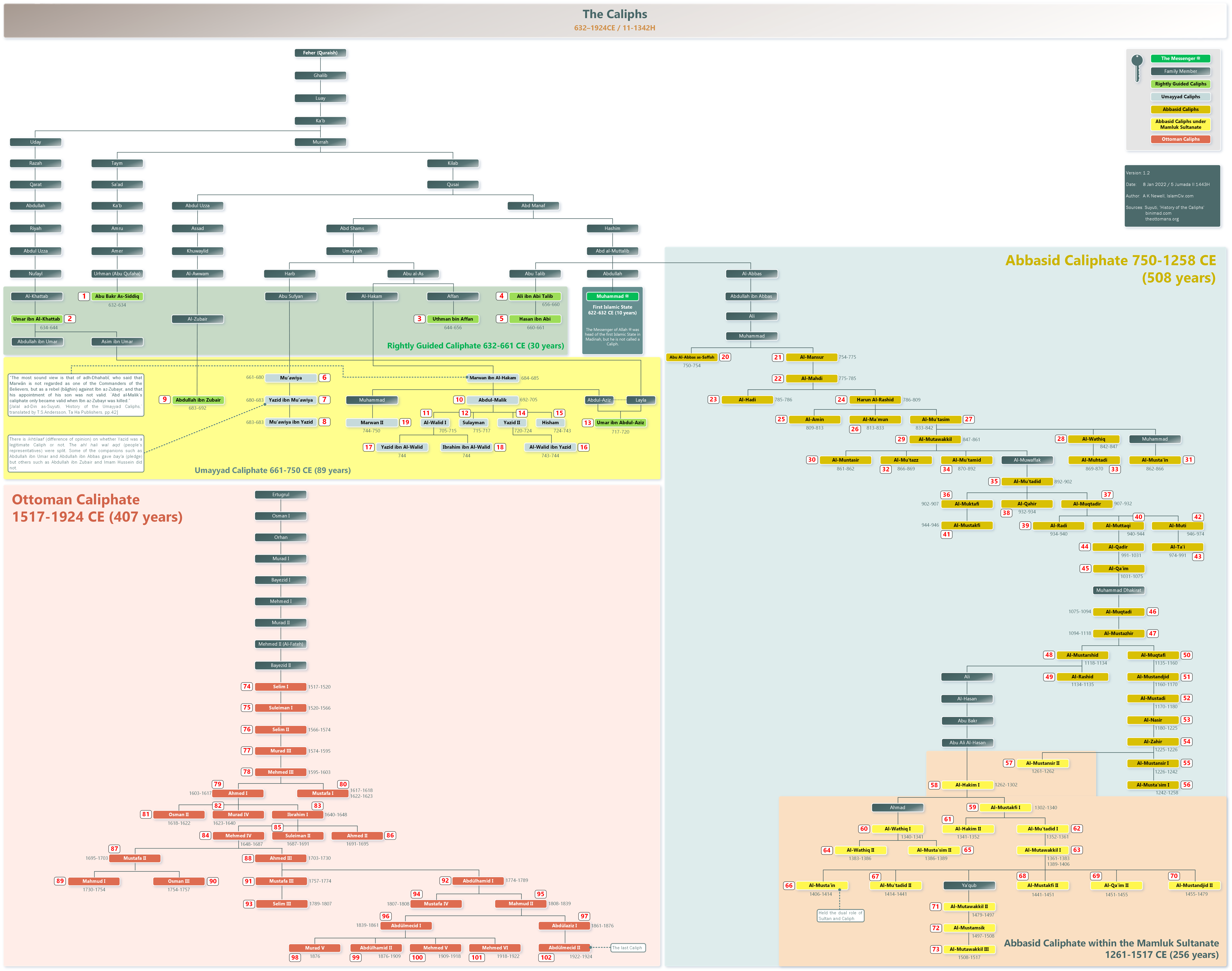 A graphical representation of the entire history of the Caliphs from 632-1924CE, 11-1342H.