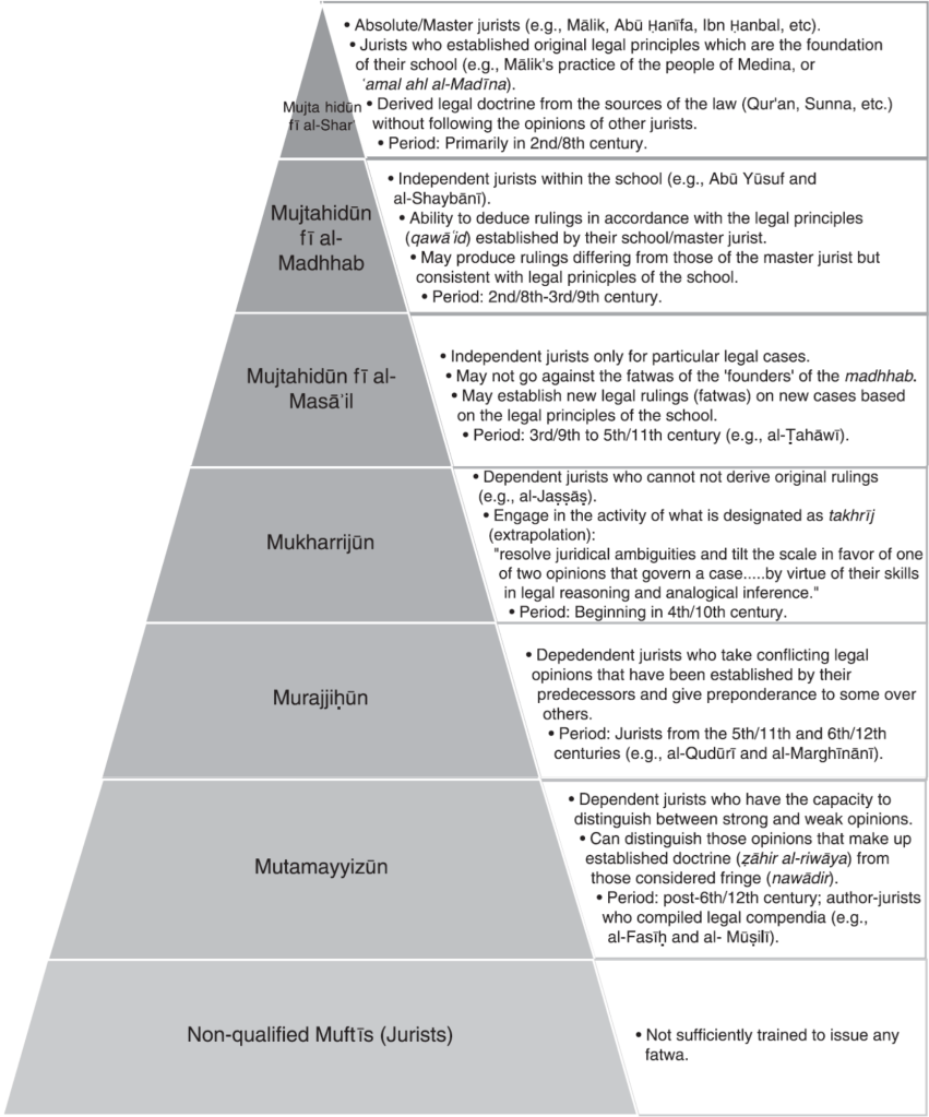 The famous Ḥanafı̄ jurist Ibn ʿĀbidı̄n (d. 1252H/1836CE) in his treatise ʿUqūd rasm al-mufti outlines a hierarchy for mujtahideen (jurists) who occupy different authoritative levels within the Ḥanafı̄ madhhab. This structure that Ibn ʿĀbidı̄n lays out consists of seven levels (ṭabaqāt).