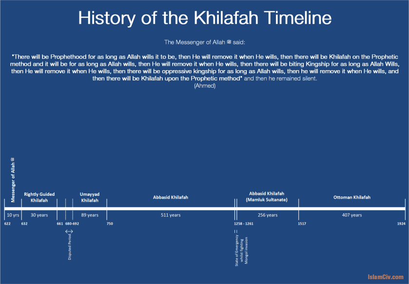 The Messenger of Allah ﷺ said: “There will be Prophethood for as long as Allah wills it to be, then He will remove it when He wills, then there will be Khilafah on the Prophetic method and it will be for as long as Allah wills, then He will remove it when He wills, then there will be biting Kingship for as long as Allah Wills, then He will remove it when He wills, then there will be oppressive kingship for as long as Allah wills, then he will remove it when He wills, and then there will be Khilafah upon the Prophetic method” and then he remained silent. (Ahmed)